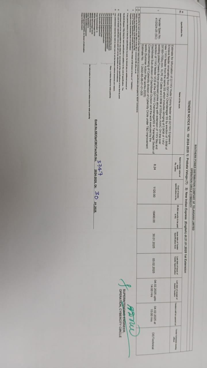 TENDER NOTIFICATION NO.07/25-26 Superintending Engineer, Operation Rajendranagar Circle. |