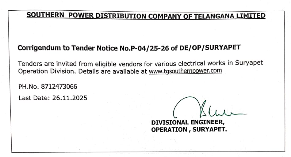 Corrigendum to Tender Notice No.P-04/2025-26 Divisional Engineer/Operation /Suryapet. |