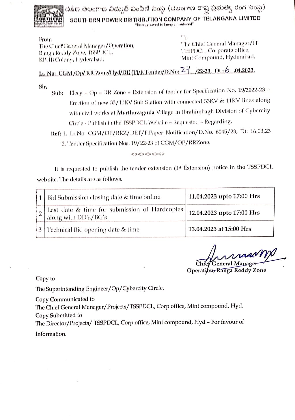 Tender Specification No.CGM/OP/RR Zone-20 21/2022-23 Chief General Manager Ranga Reddy Zone, TSSPDCL, KPHB Colony, Hyderabad. |