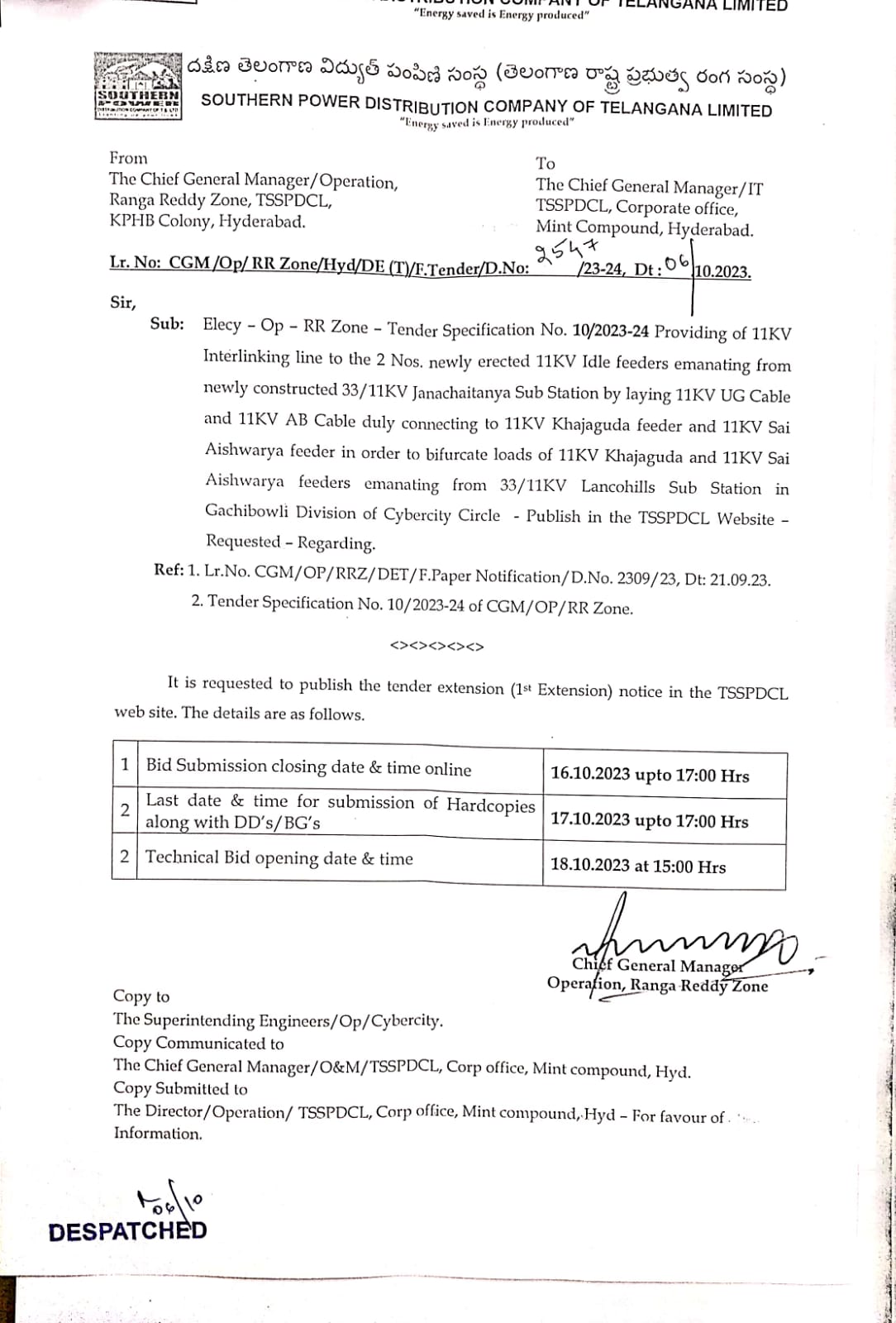 E-Procurement Tender Notice.01/2023-24. Tender Specification No:01 02/2023-24 1st extension extension of specification No.17/2022-23 Chief General Manager Operation, Rural Zone,TSSPDCL,Gagan Vihar, Nampally, Hyd.